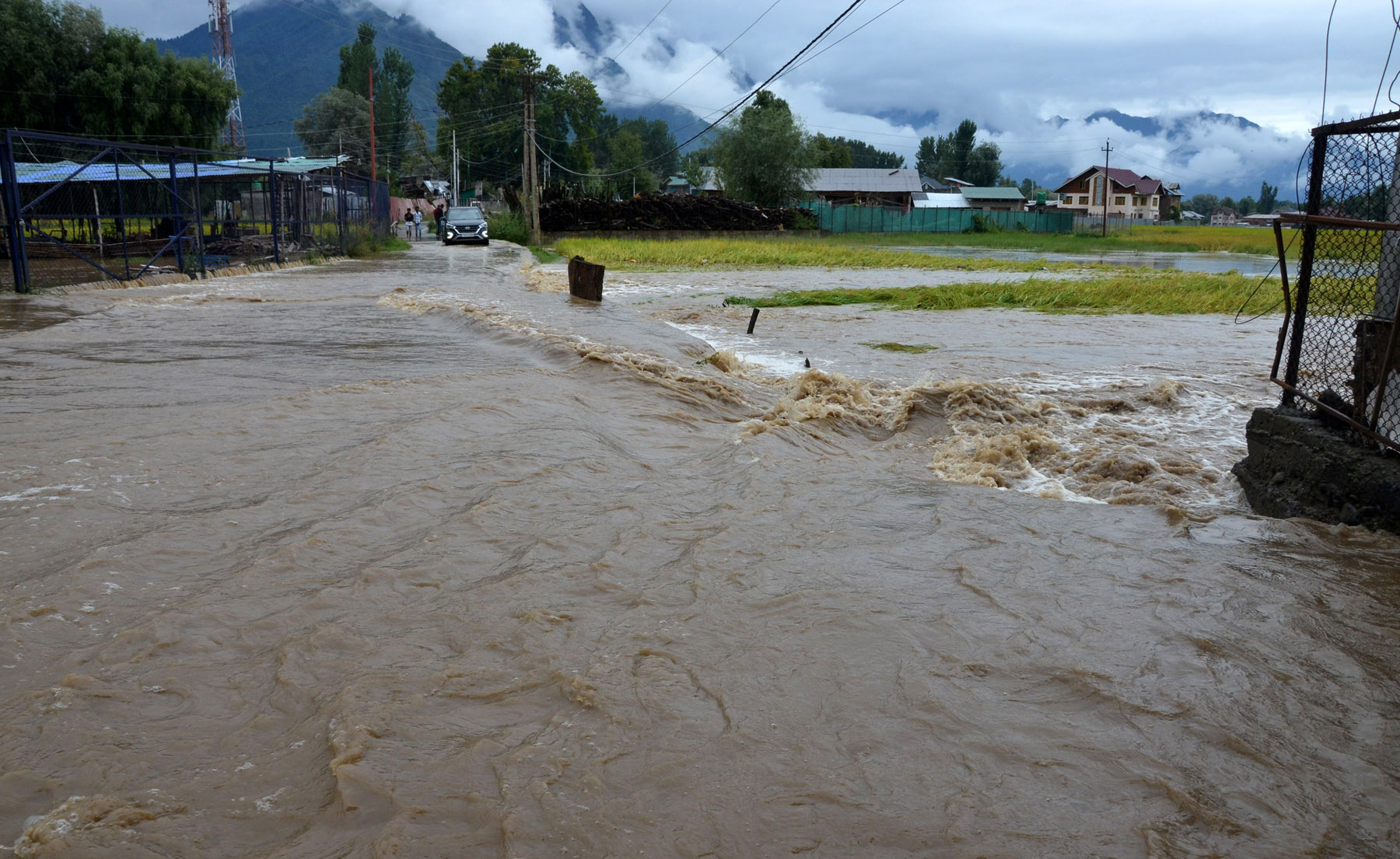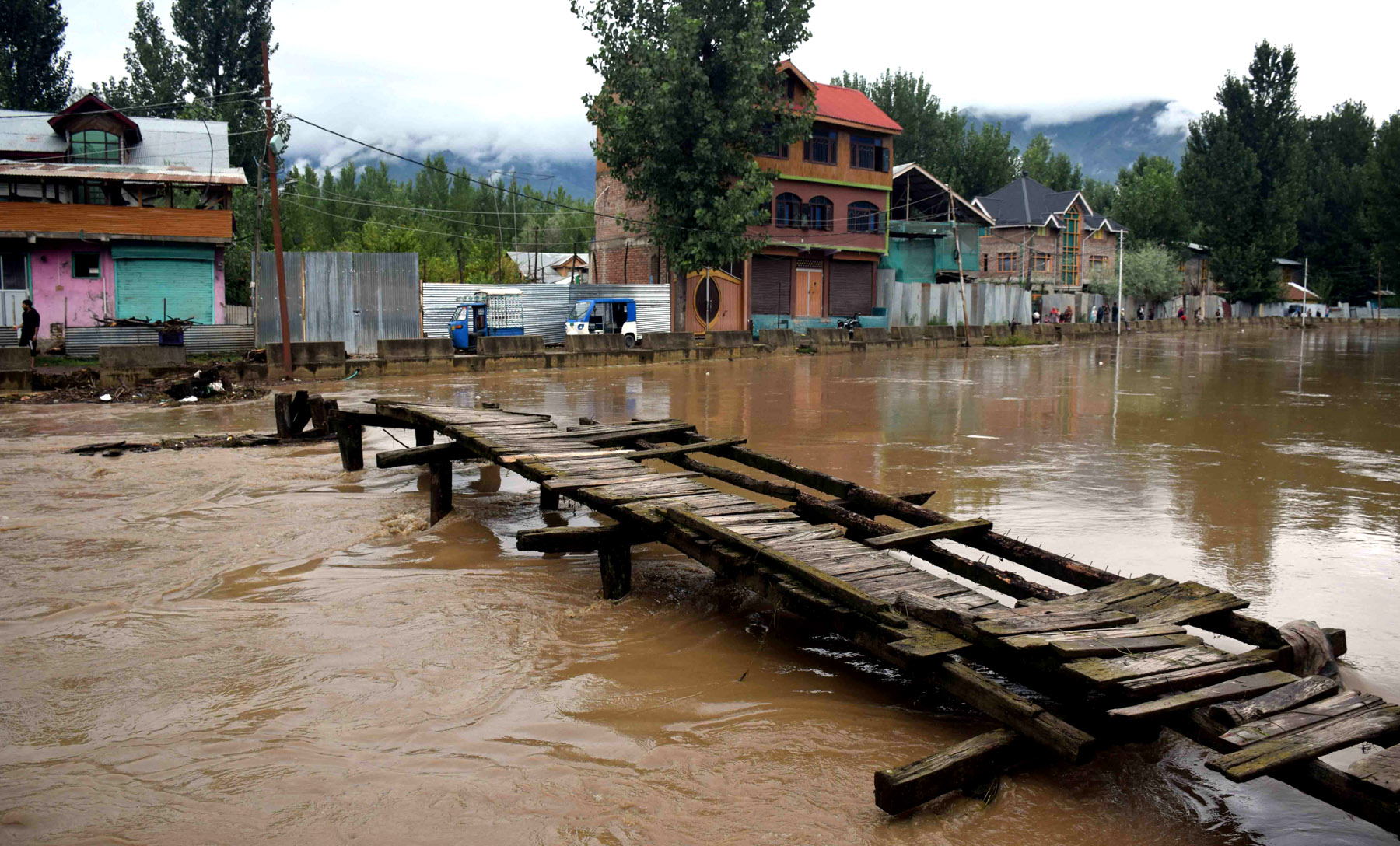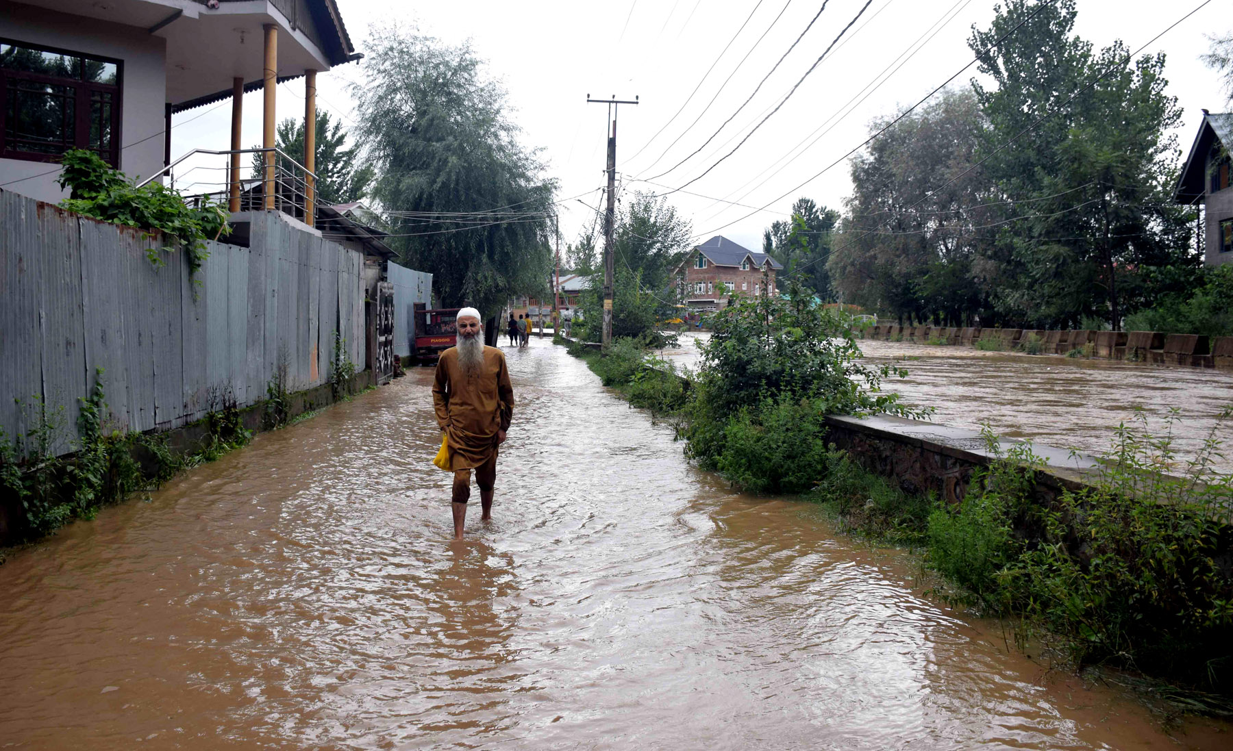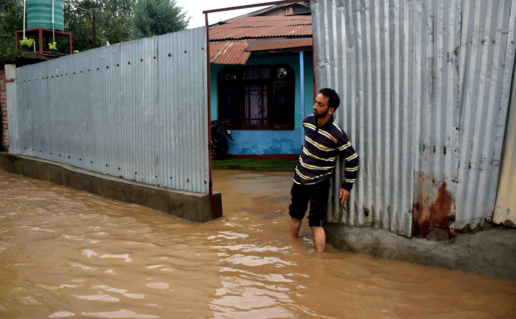 Continuous rainfall caused a breach in the flood channel at Khushipora Teilbal in the Hazratbal area on the outskirts of Srinagar, leaving homes and roads submerged.