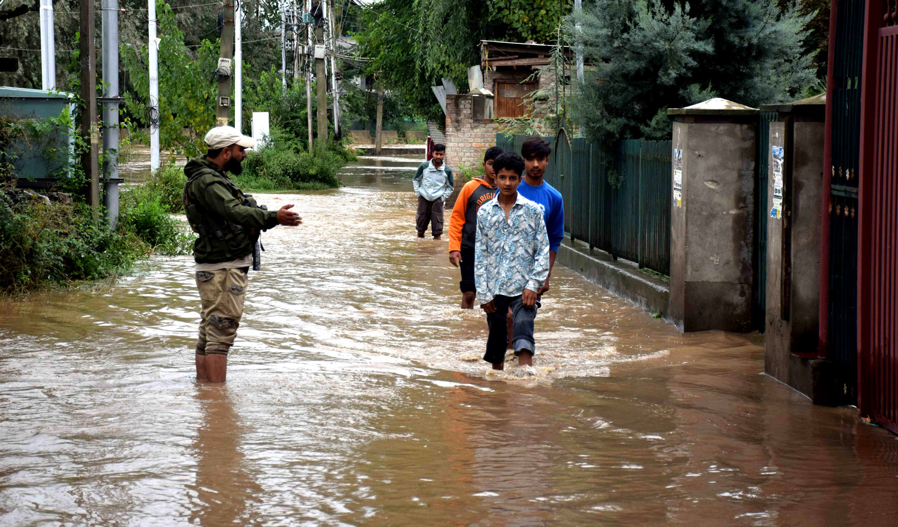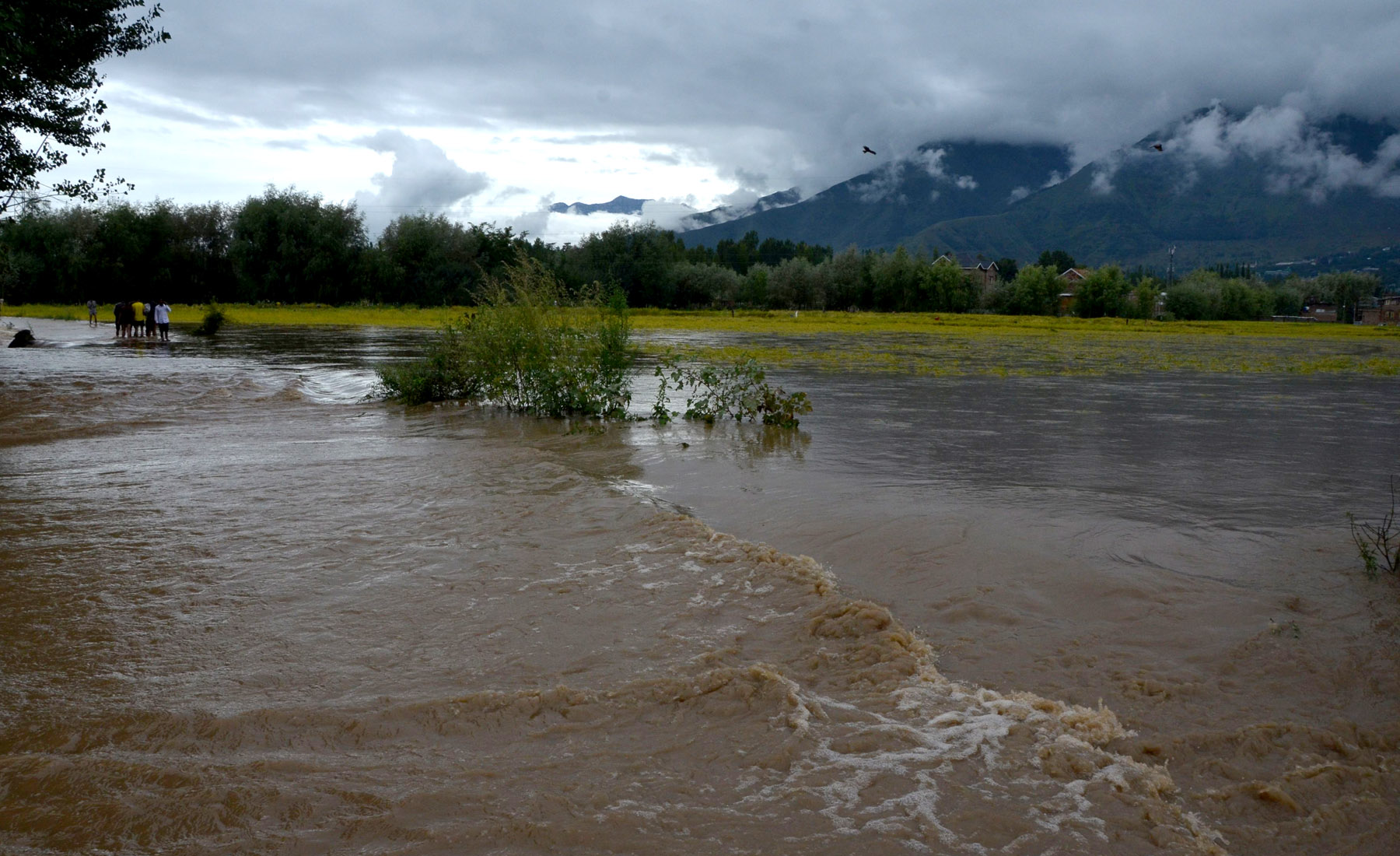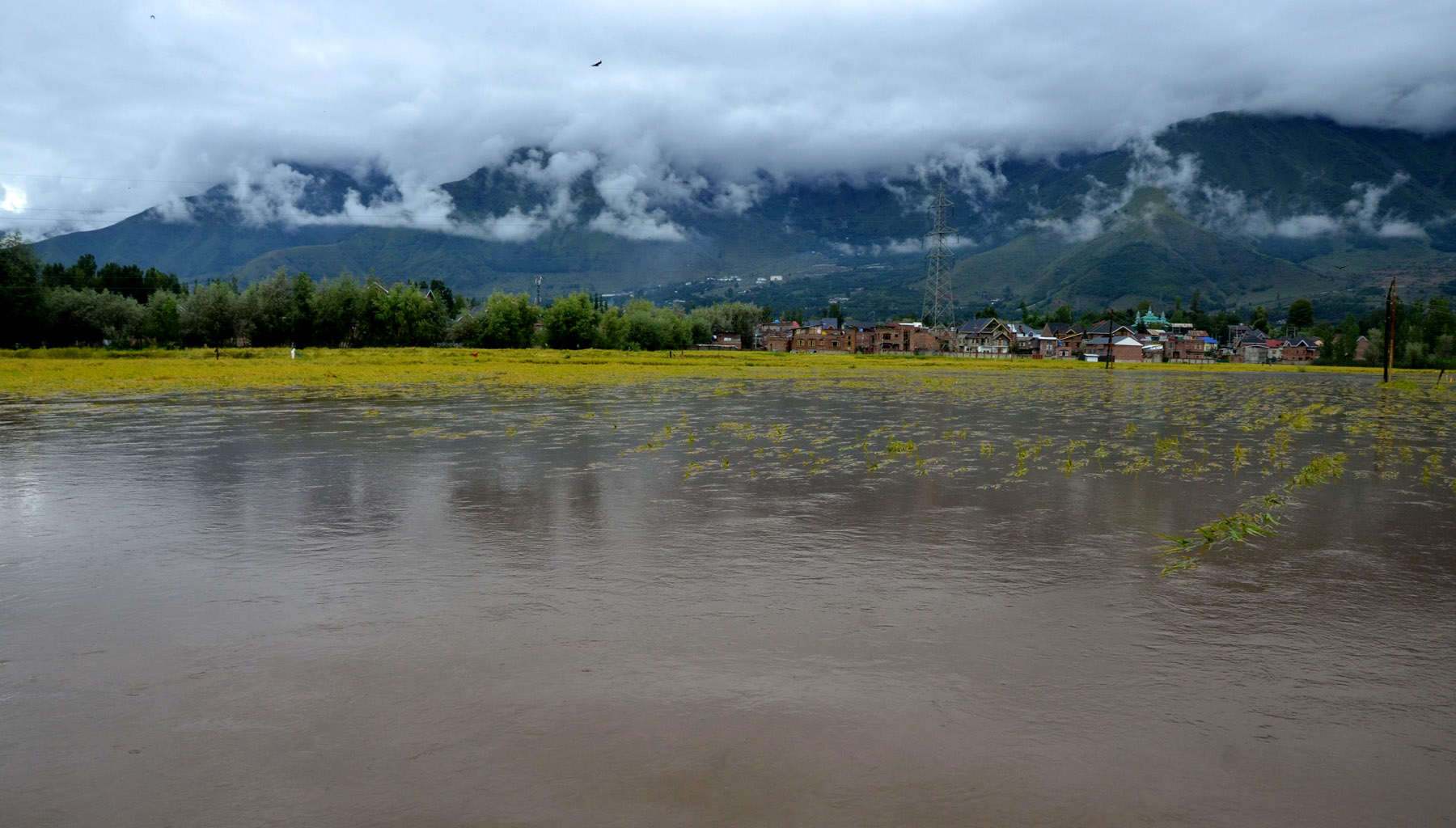 Continuous rainfall caused a breach in the flood channel at Khushipora Teilbal in the Hazratbal area on the outskirts of Srinagar, leaving homes and roads submerged.