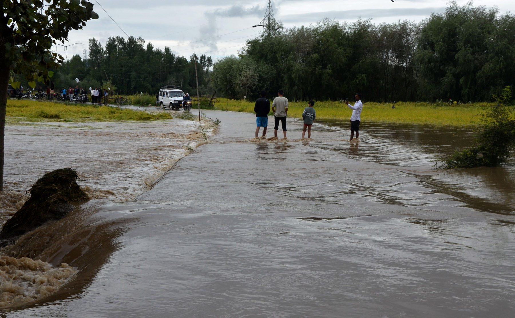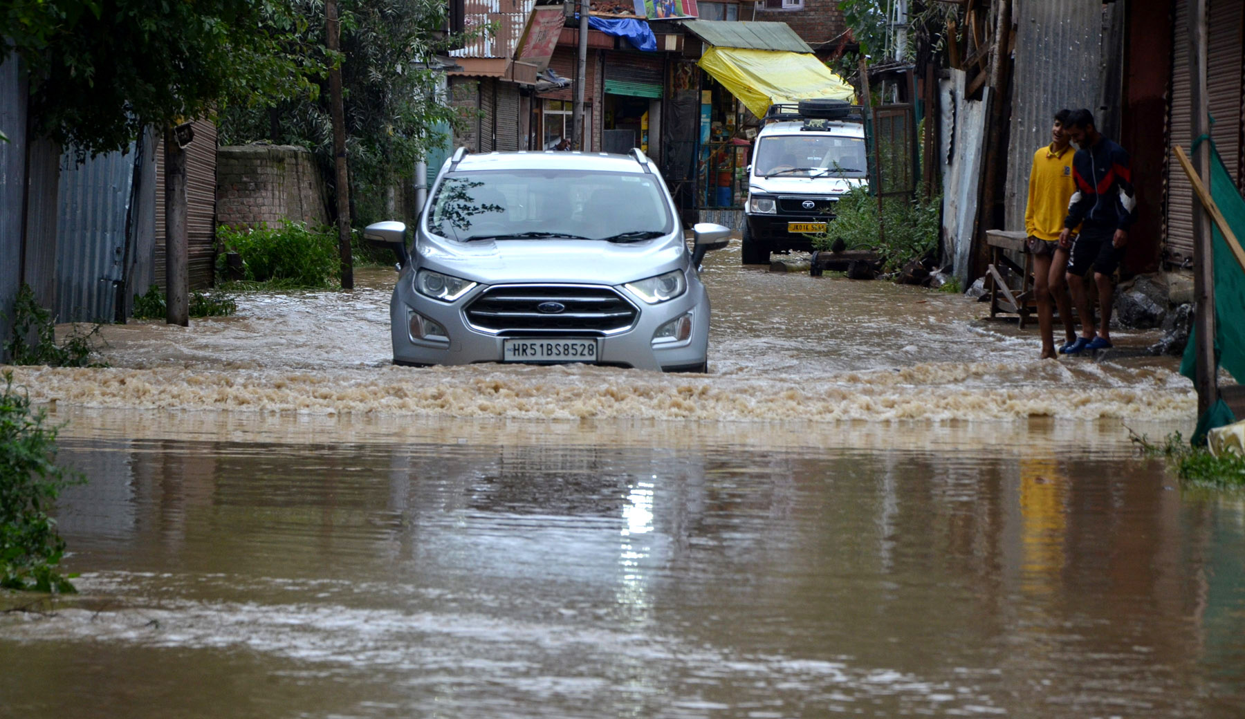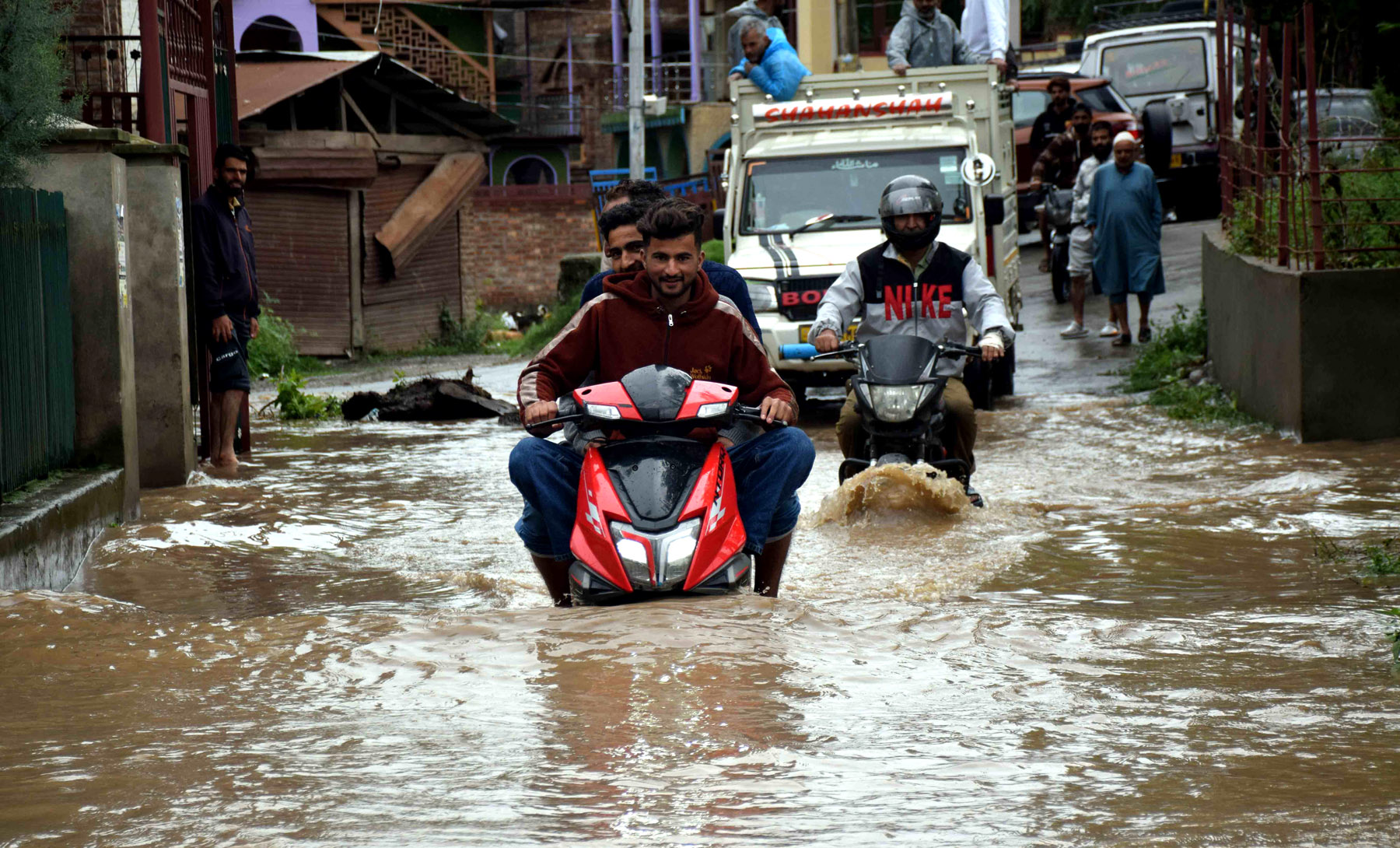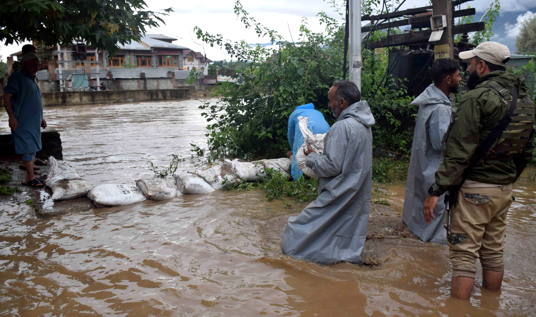 Continuous rainfall caused a breach in the flood channel at Khushipora Teilbal in the Hazratbal area on the outskirts of Srinagar, leaving homes and roads submerged.