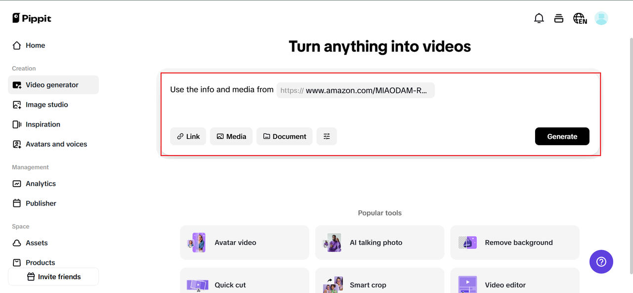 - For videos: Click Video generator on the left panel, paste your product link, and hit Generate. Pippit’s AI will extract your product details and suggest punchy slogan-based scripts under Advanced settings > Script. Refine your favorite line, then click Confirm and Generate to bring it to life.