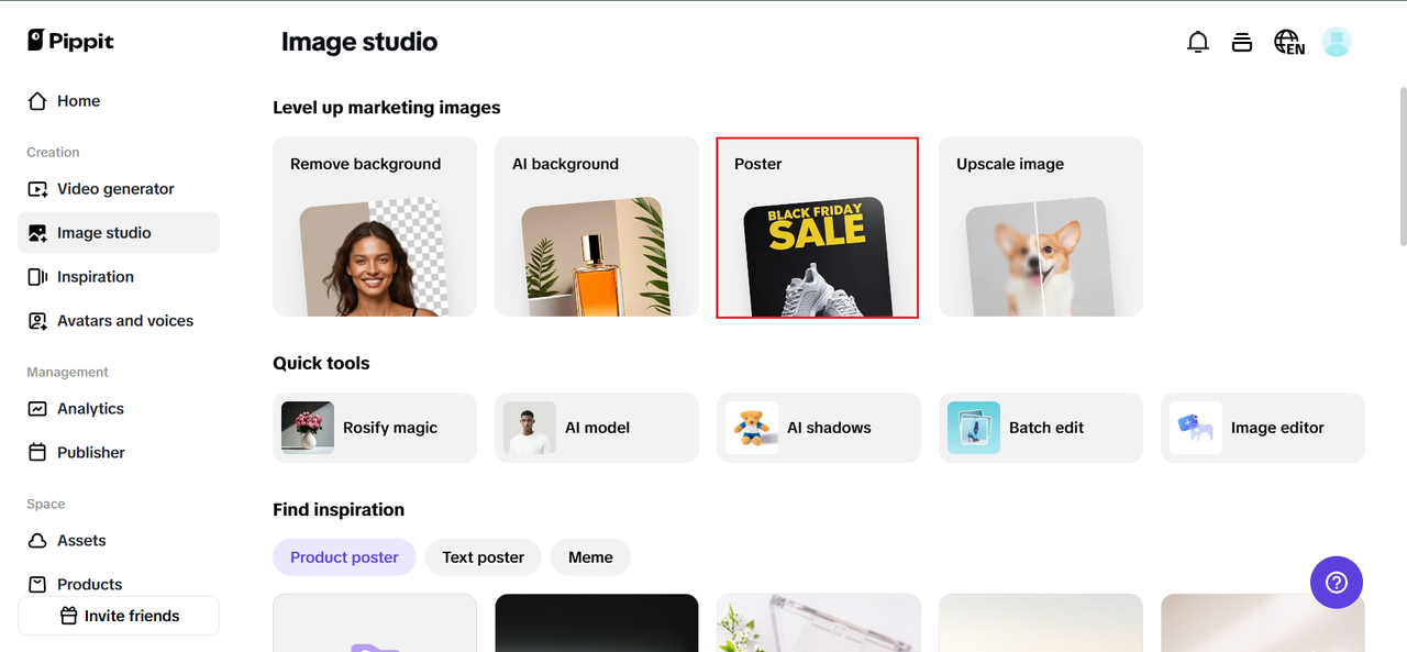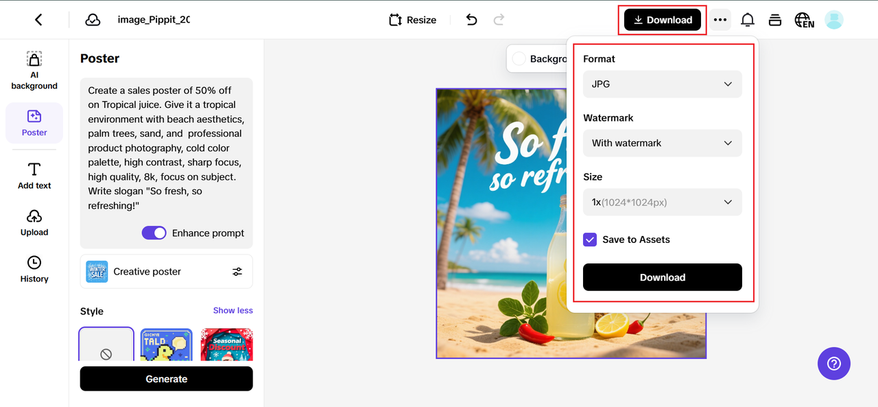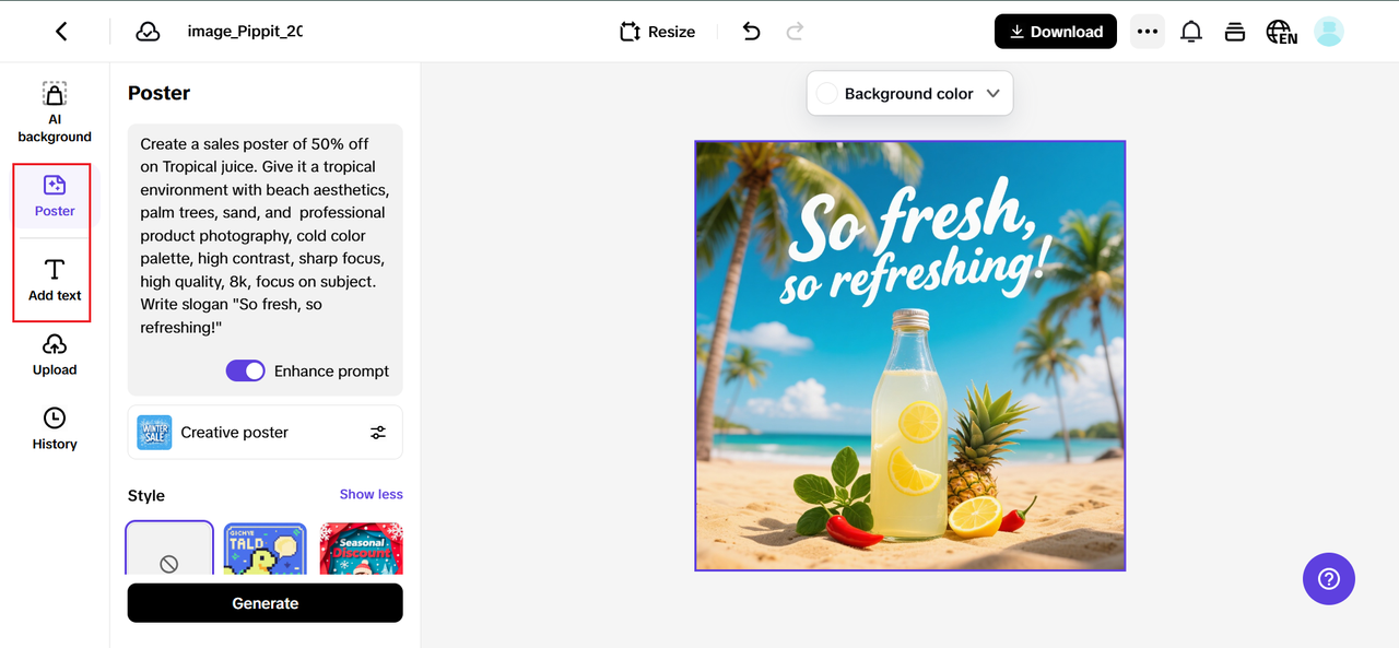 - For posters, tweak backgrounds with the AI background generator, add your logo, or try seasonal variations.