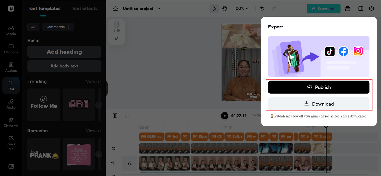 - For videos: Click Export and choose Publish or Download. Tweak your resolution, format, and quality, then post it on your ads, Stories, or Reels.