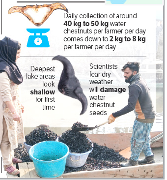 Even though the water chestnut farmers were jubilant at the summer harvest of fresh green chestnuts, the dry weather conditions in winter in Kashmir severely affected the winter harvest of mature water chestnuts.