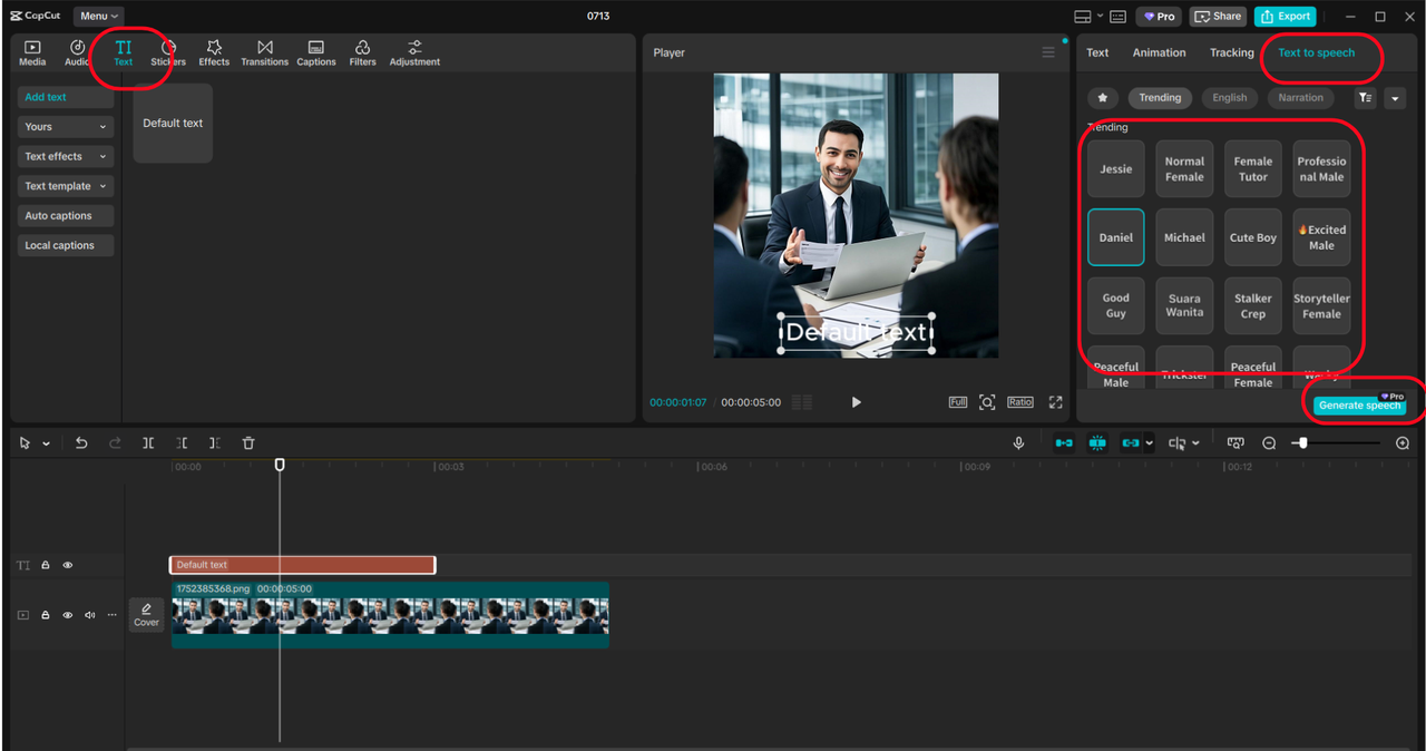 Go to the "Text" menu, switch to the "Text to speech" tab, and select "Trending". Enter the offer script, opting for a voice like "Professional Male" or "Good Guy". Use underline formatting and adjust speed or pitch, then preview and adjust the audio.