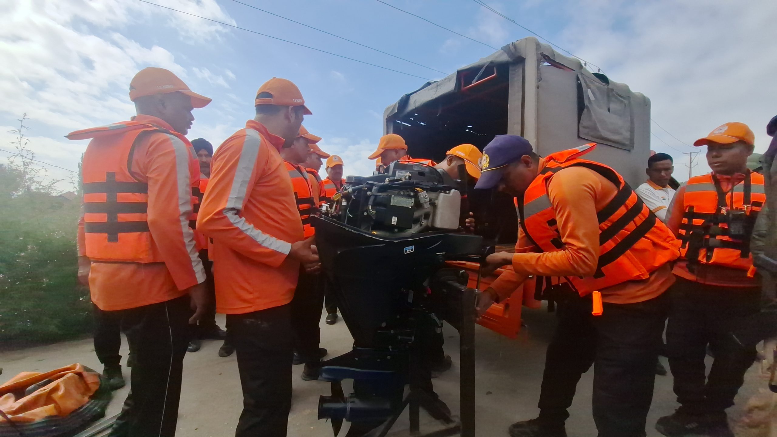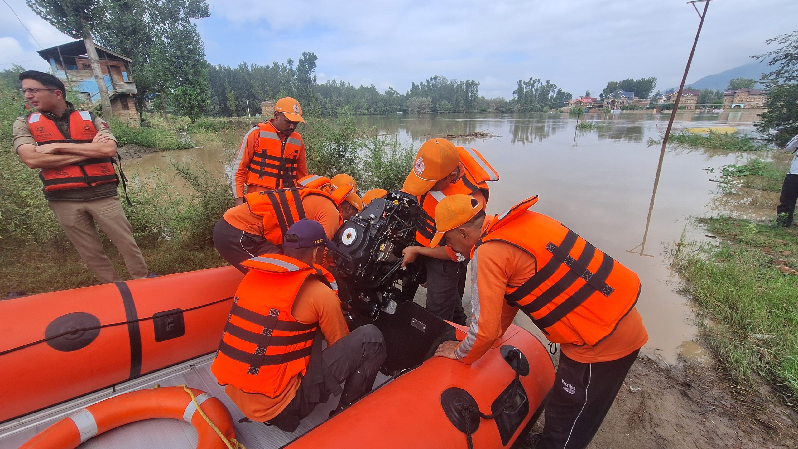 NDRF personnel prepare inflatable boats as flood waters inundate Zonipora Khankabal in Pampore