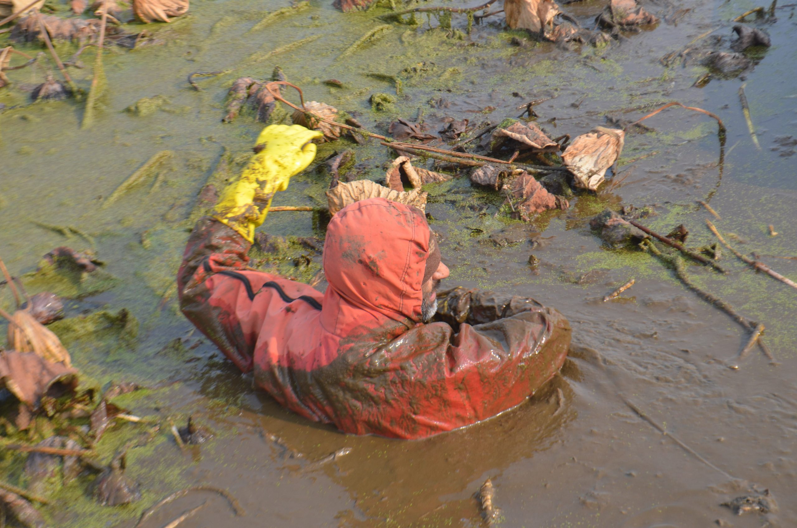 As the men dive and start looking for lotus stems with their feet, creating wobbles in the water, the lake reveals its dirty secrets: a strong stinking smell fills the air, making it nearly impossible for outsiders to stay there.